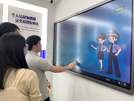警务室李文杰教导员带领学生党员重点参观了禁毒、网络安全、反恐和反诈等内容,并鼓励同学们积极参与现场有奖竞答,进一步提升安全防范意识。他建议同学们在班级群分享“守住你的口袋”微信小程序,沉浸式体验各类诈骗套路,让更多同学了解诈骗、远离诈骗。冯珍全警官强调,党员同志们必须时刻保持高度的警觉性和自律性,以身作则,言行一致,在维护社会治安、促进校园和谐稳定中展现责任与担当。