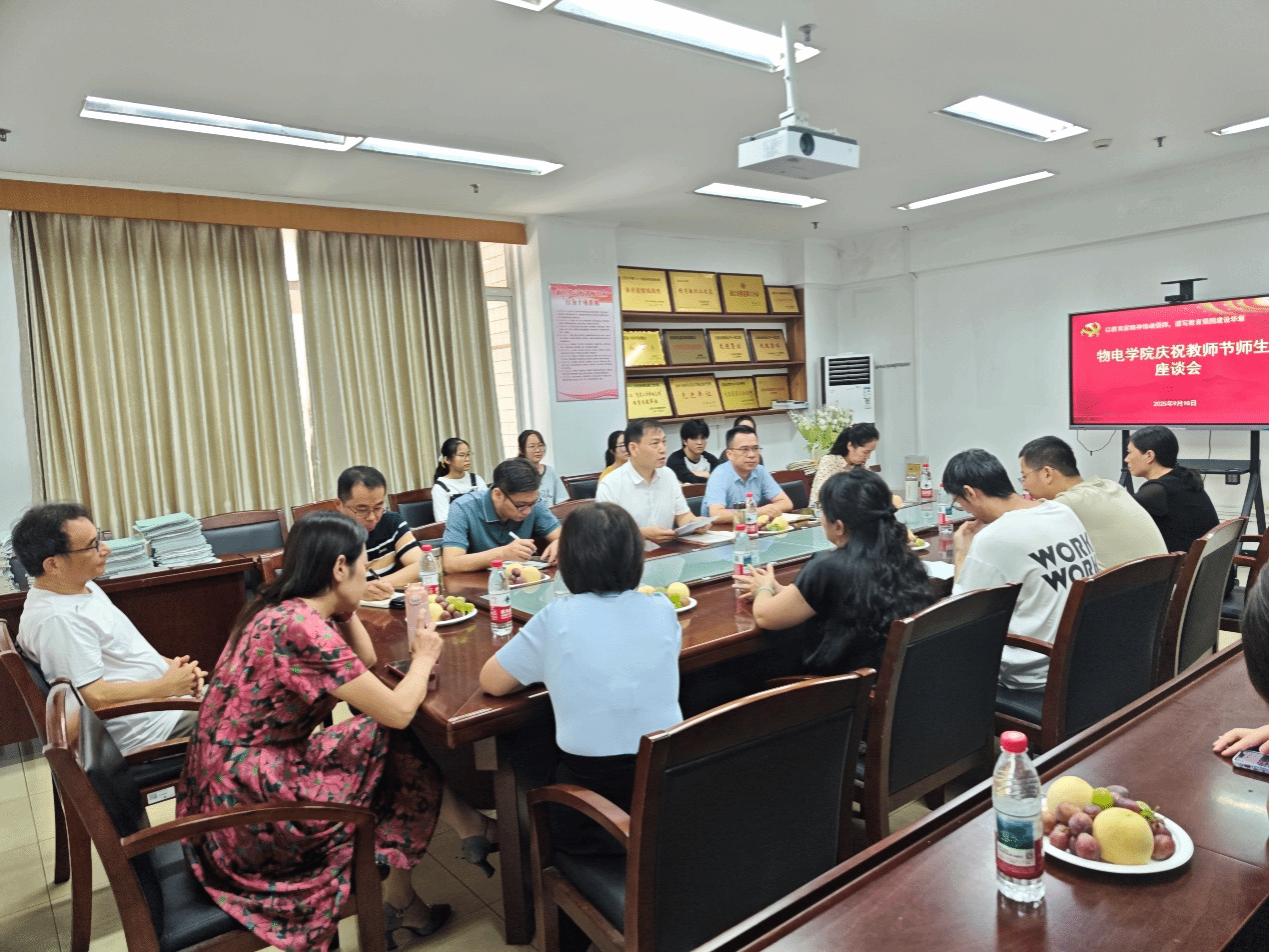 9月10日上午,成人网址 在物理楼301召开主题为“以教育家精神铸魂强师,谱写教育强国建设华章”的师生座谈会,庆祝第41个教师节。院党委书记潘金彪,院长陈元平,副院长孙宏祥,党委副书记、副院长顾瑜婷,副院长徐晶出席座谈。参加座谈的还有分工会主席殷红飞,行政办主任邢亚林,关工委教师朱敏,辅导员刘振等十余名教师代表和5名学生代表。座谈会由潘金彪主持。