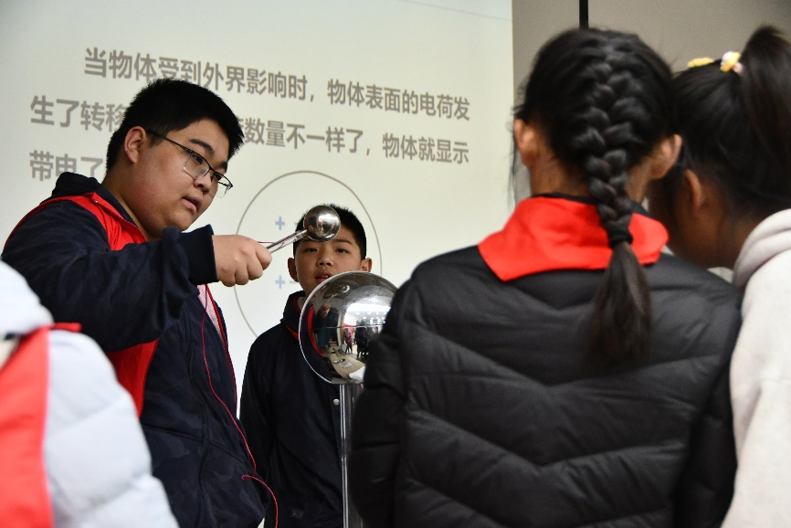 为了进一步加深大家对静电现象的理解,志愿者们还带来了专业实验器材——范德格拉夫起电机,利用范德格拉夫起电机向孩子们生动地展示了电荷同性相斥、异性相吸的特点,通过不同的实验效果对比,让同学们对静电有了更深刻理解。