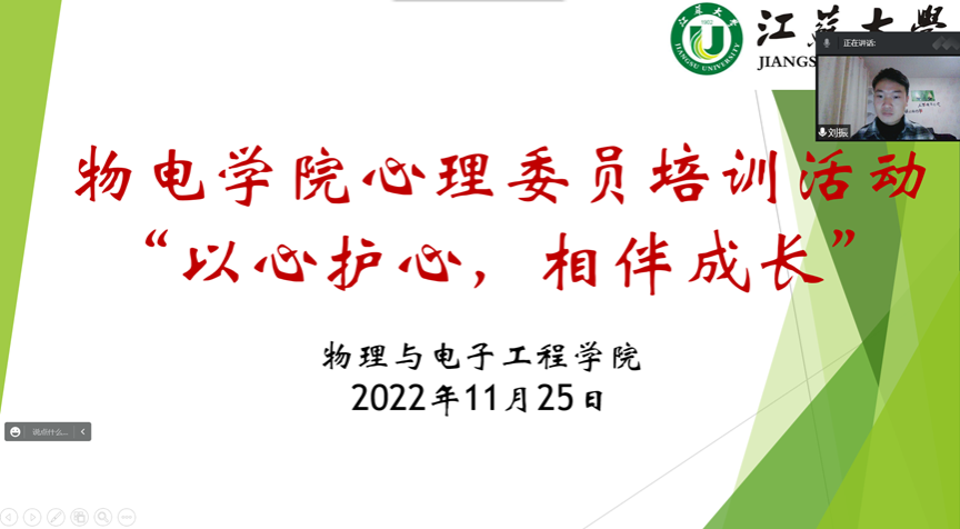 11月25日,为充分发挥班级心理委员的心理健康知识普及、提升心理委员自身素质,成人网址 线上通过腾讯会议举办“以心护心,相伴成长”主题培训。培训会由刘振主持,全体心理委员参加。