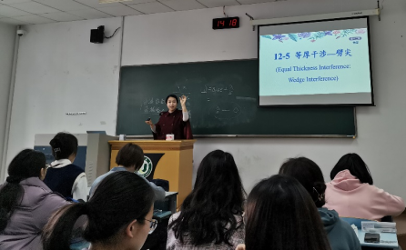 公开课上,冯旭以实际应用中的测量问题为切入点,启发学生思考并讲授有关劈尖的知识及其应用。从劈尖干涉的实验装置及实验现象,到干涉明暗纹条件光程差表达式的推导和干涉条纹特征的分析,再到劈尖在工业生产和日常生活中的应用,讲课生动有趣,教学课堂活跃,使同学们对劈尖定性了解和定量分析的同时,更深刻感受到劈尖的用途之广和用法之妙,激发了同学们对物理课程的学习兴趣和理论指导实践的认识。