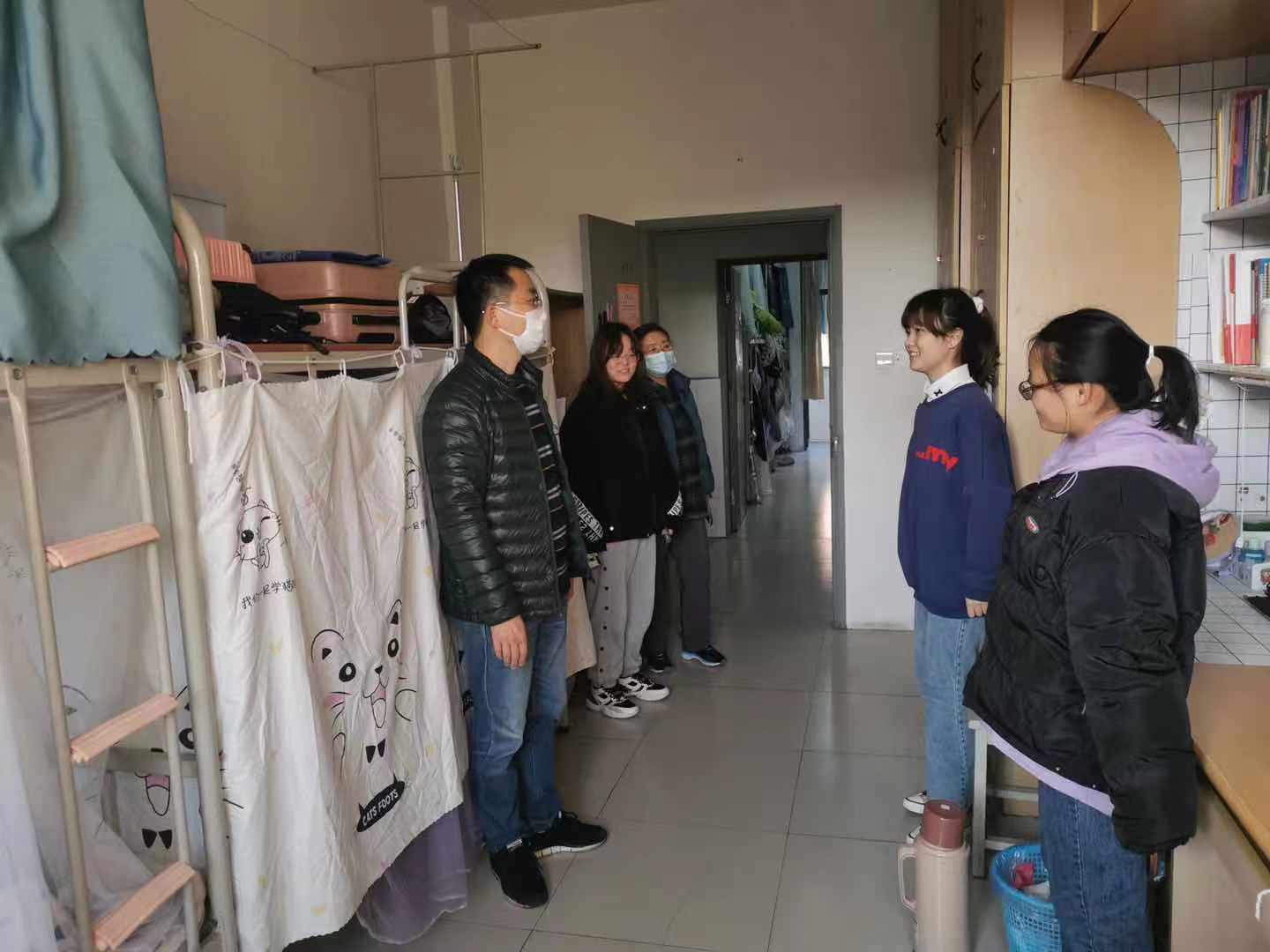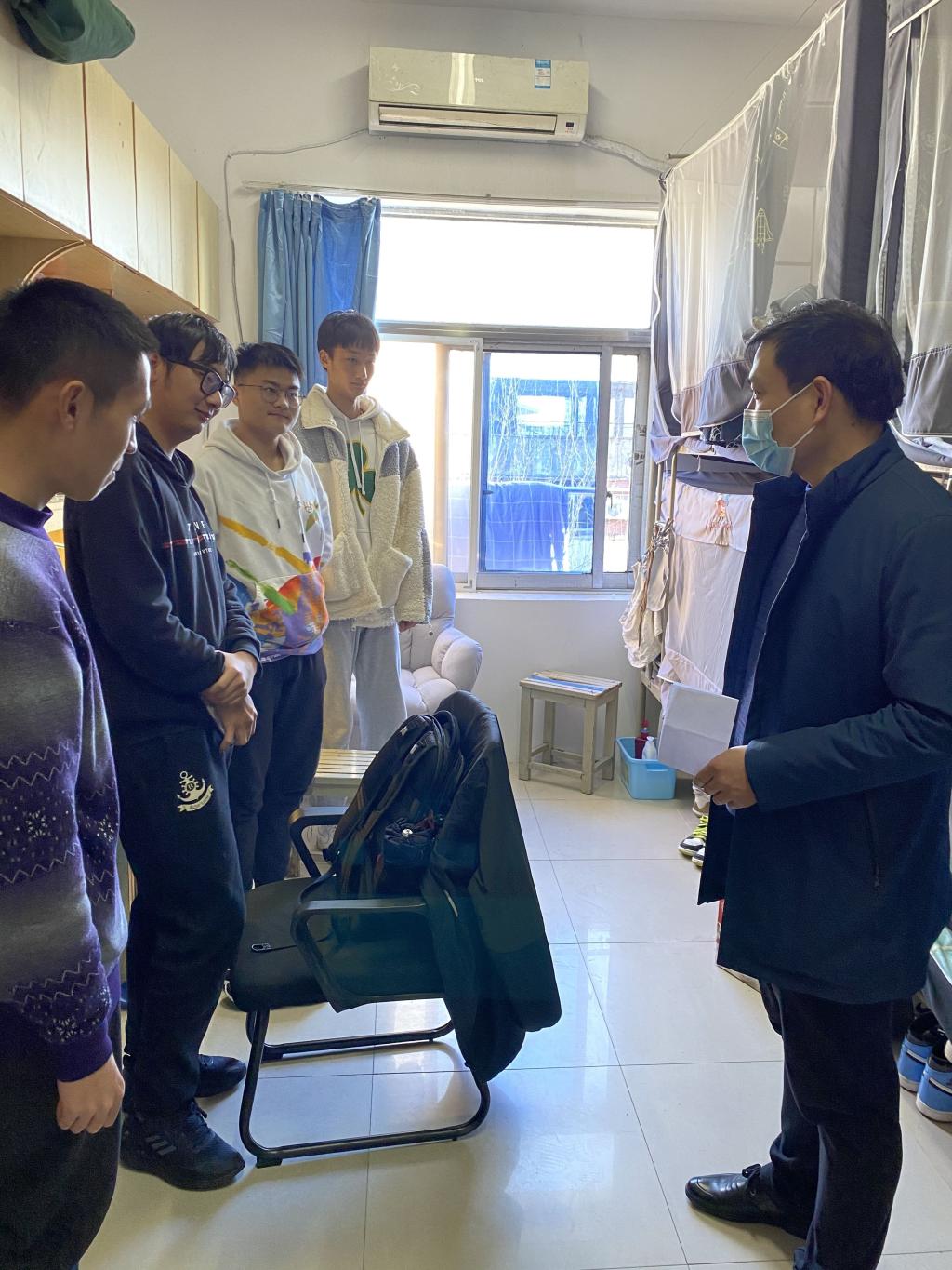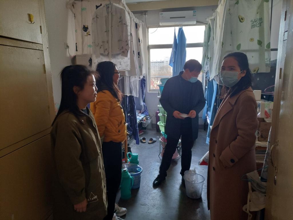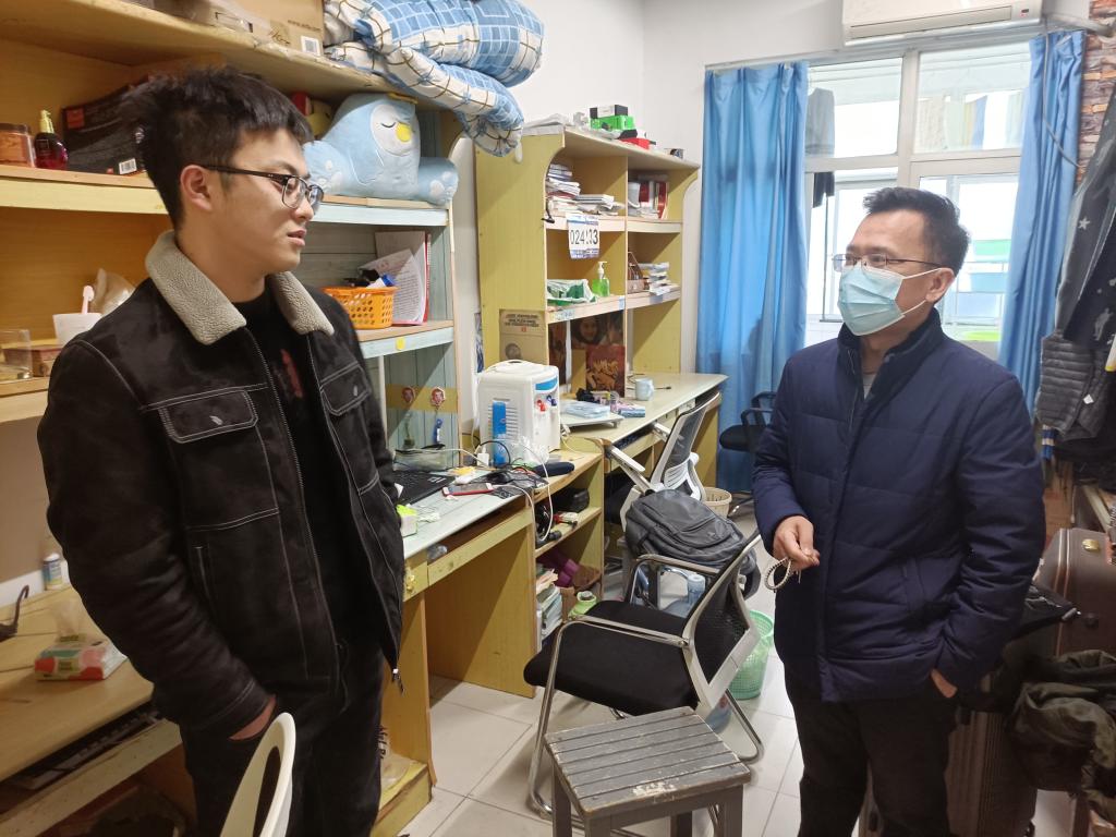 走访过程中,学院领导、辅导员与学生亲切交谈,了解同学们寒假期间的所学所获,询问新学期的学习计划,初步掌握了学生新学期初的思想动态。此外,学院领导叮嘱同学们,疫情常态化管理期间,一定要严格遵守学校的相关规定,保持宿舍卫生,坚决杜绝违章电器,保证安全、舒适的生活学习环境。