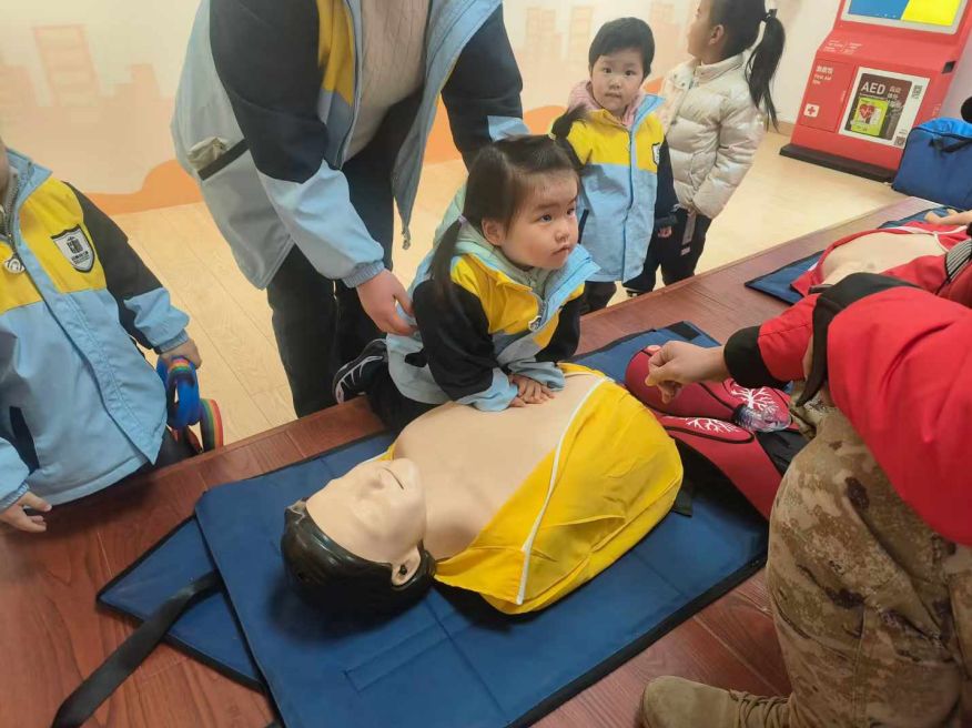 志愿者进行急救知识讲解,包括急救类型、方法、措施、工具等。志愿者们向社区儿童展示急救动作要领,传递急救技能,运用语言和肢体动作让居民了解基本的急救措施,向社区居民展示了心肺复苏流程、人工胸外按压、开通气道、人工呼吸等技能,增强居民的急救意识。