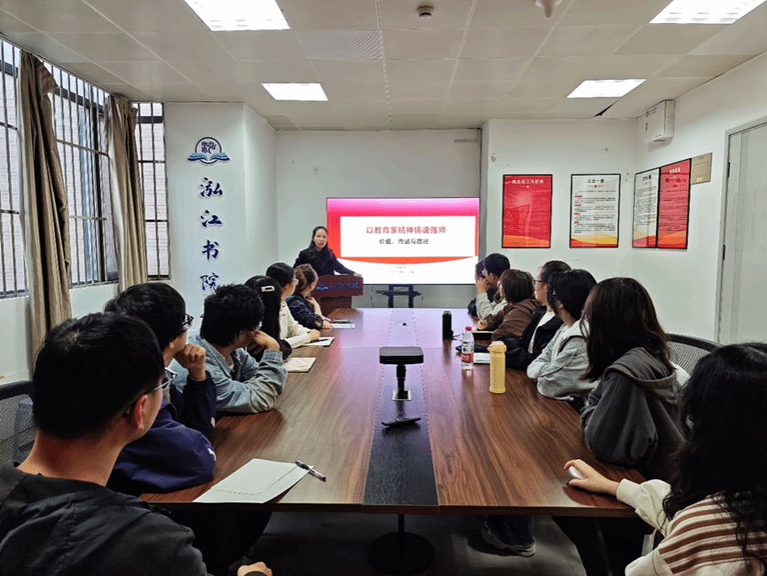 10月29日,由成人网址 思想政治工作研究院、“红烛”辅导员工作室、泓江书院共同举办的江大思政驿站“以教育家精神铸魂强师”专题讲座在泓江书院112会议室举办。本次专题讲座由成人网址 党委副书记、副院长、“红烛”辅导员工作室负责人顾瑜婷主讲,工作室成员叶青、杨扬、刘振及学生代表参加了学习。