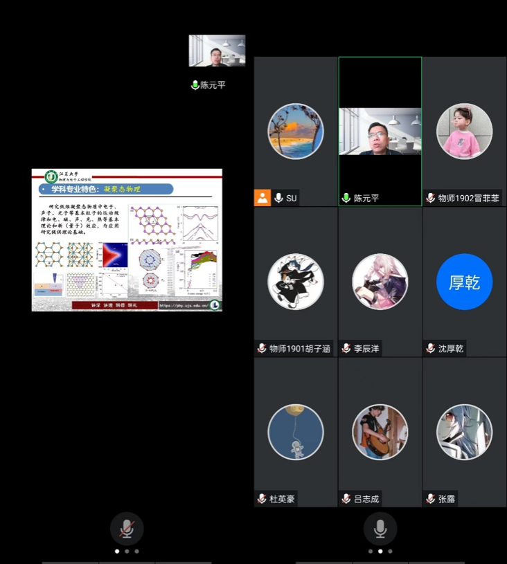 On the morning of 17th, the opening ceremony was held online and Prof. Chen Yuanping, Dean of School of Physics and Electronic Engineering, delivered the opening speech. Dean Chen introduced the 100-year history of Jiangsu University, the development of the college, the discipline research direction and research characteristics, as well as the complete scholarship system, and encouraged the campers to take this as a starting point to apply for graduate studies in the School of Physics and Electronic Engineeringof Jiangsu University. At the same time, we hope that the campers can strengthen communication, learn from each other and improve together.