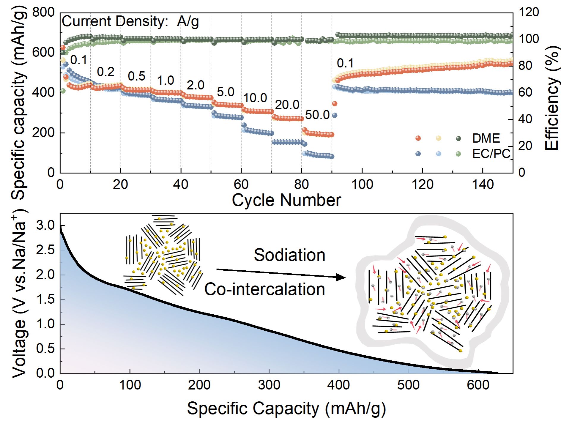 该论文报道了一种高性能硫掺杂碳纳米片(SDCNs)负极材料用于钠离子电池。研究创新性地发现,醚基电解液(DME) 对SDCNs的性能至关重要。与酯基电解液相比,在DME中,SDCNs展现出显著提升的倍率性能:在50 A/g超高电流密度下仍能提供191 mAh/g的比容量。同时,其在0.1 A/g下循环300周后比容量提升至617 mAh/g,表现出优异的循环稳定性和自优化能力。机制研究表明,醚基电解液促进了溶剂化钠离子的共嵌入,扩大了碳层间距,形成了超薄固态电解质界面膜,从而极大提升了体相和界面的离子扩散与存储动力学,有效激活了内部的碳纳米空隙和硫掺杂位点。该工作为高性能钠离子电池碳负极材料及电解液的设计提供了新思路。